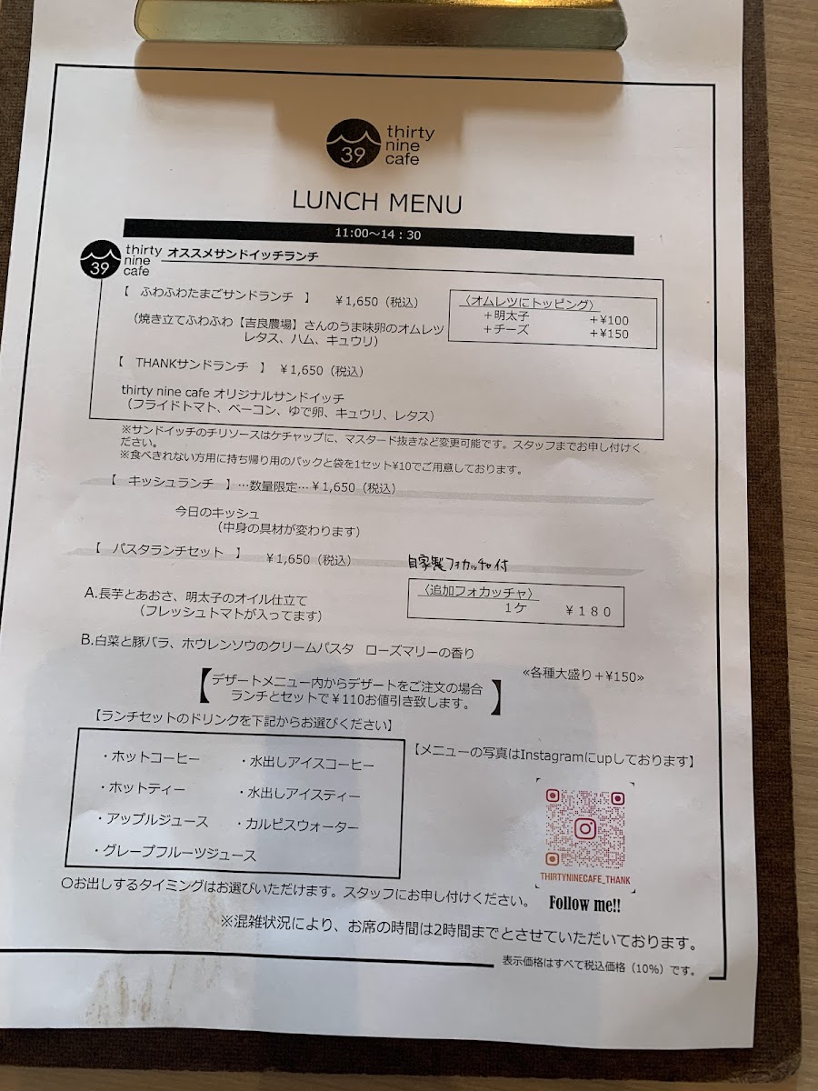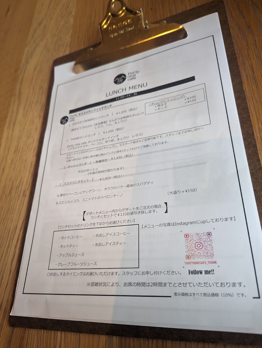 Thurty Nine Cafe Menu